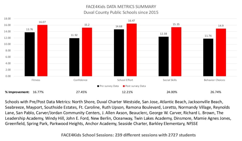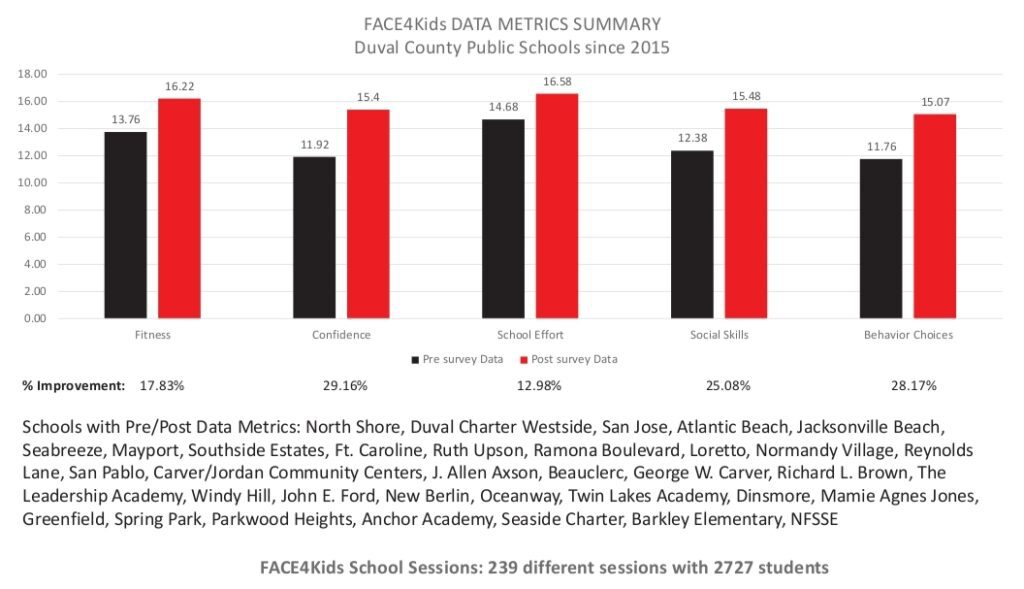 Each School had a counselor that was committed to and supportive of the FACE program being implemented within their Duval County Public School. Also, started in Chester County PA in 2012*. The Teachers had to fill out a PRE Survey for each student attending the youth leadership program. There are 5 Main categories with Metrics summarized on the students since 2015-2016. Each category has two tasks being valued with a numeric score, with the values added per student. The Values represent a Summary of averages per school per category. After the FACE graduation occurs at each school, the contact counselor is asked to gather the same information for a POST survey with regard to each student completing and graduating from the program.